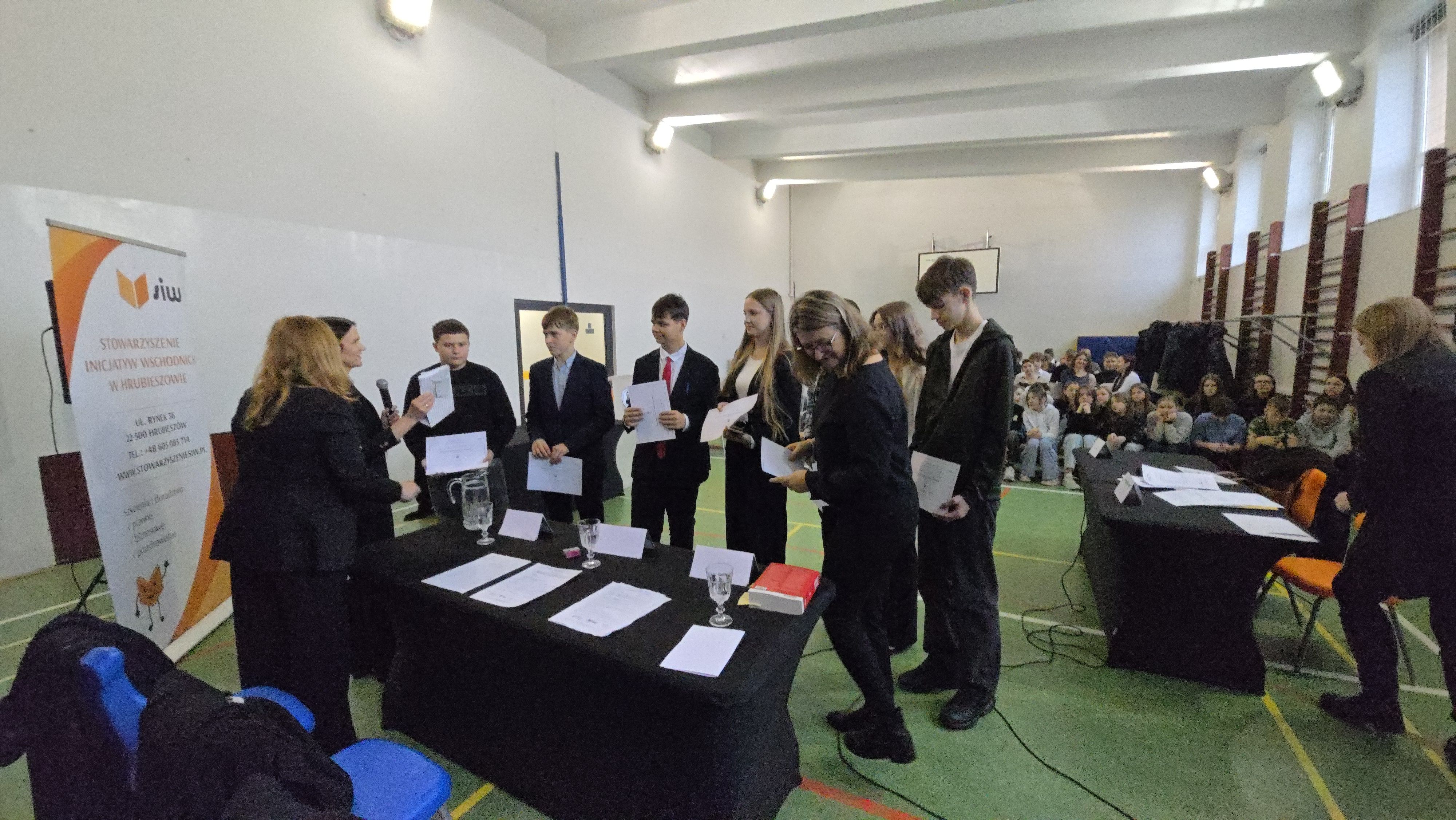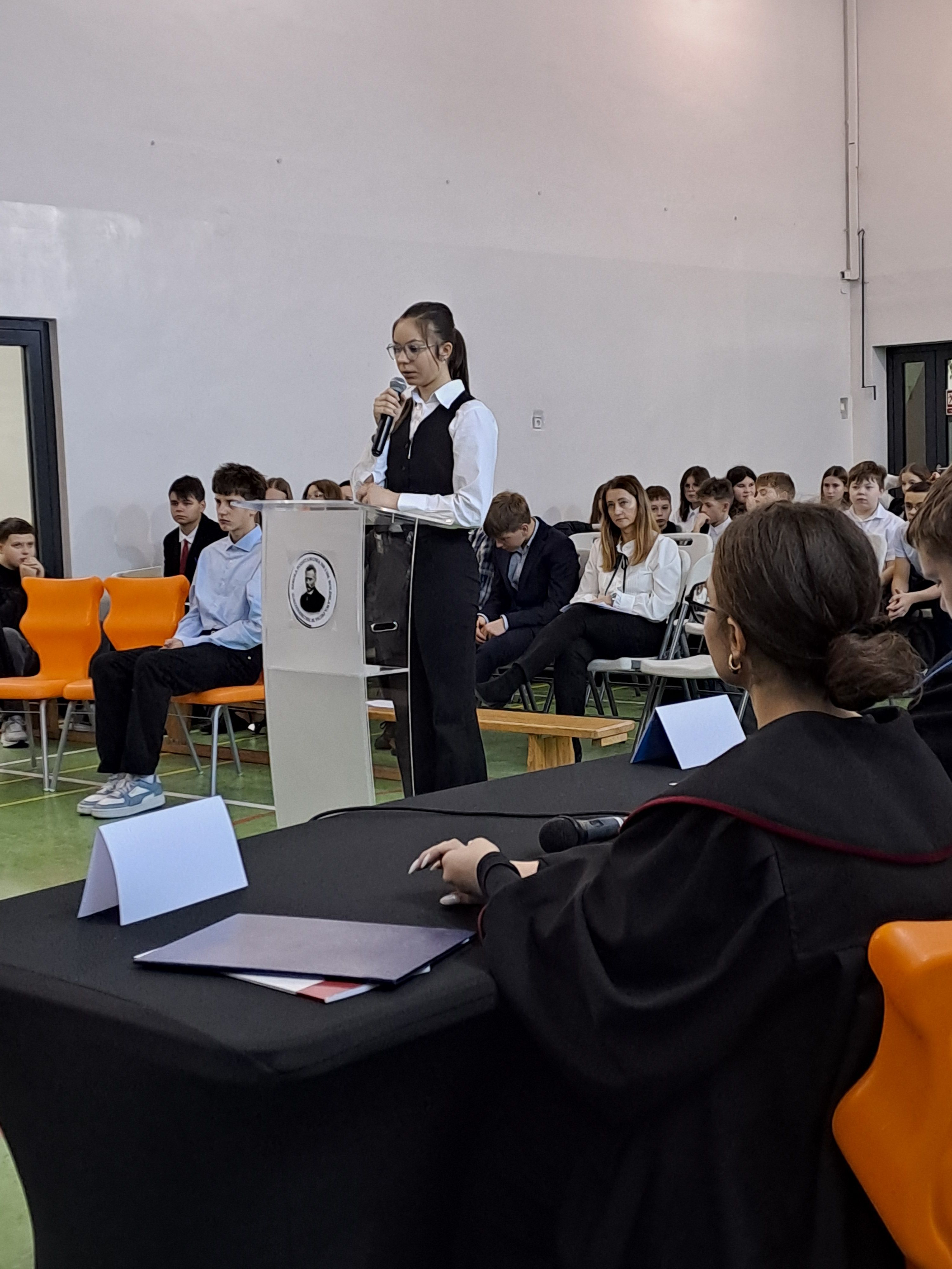 Uczniowie wcielili się w rolę uczestników postępowania karnego: prokuratora, oskarżonego, obrońcy, pełnomocnika pokrzywdzonego oraz świadków. W komisji konkursowej zasiedli: Pani Sędzia Sądu Rejonowego w Hrubieszowie, adwokatka i mediatorka sądowa. Sprawa dotyczyła przywłaszczenia psa. Było profesjonalnie.